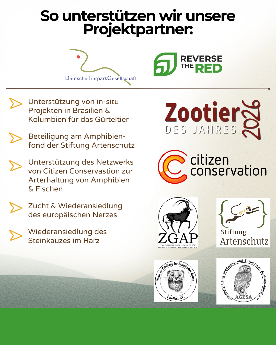 Hinzu kommen die von der DTG unterstützten Projekte: das Zootier des Jahres 2026, der Kronenkranich, der europäische Nerz, Amphibienprojekte mit Citizen Conservation und dem Amphibienfonds, sowie die Wiederansiedlung des Steinkauzes im Harz.